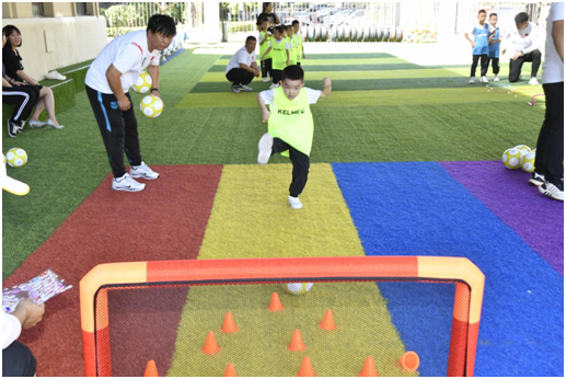 为使活动达到良好的效果和目的,足球教研室全体教师在国家少儿足球运动专任讲师的培训和指导下,集体备课制定出一套适合幼儿园小朋友心理生理特点的足球运动教学方案。
